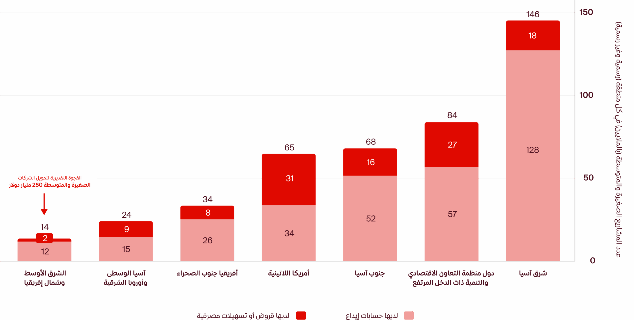 في منطقة الشرق الأوسط وشمال أفريقيا، بدأت هذه الفجوة تتقلص تدريجيًا. تشير التقديرات إلى أن إجمالي الطلب على تمويل الشركات الصغيرة والمتوسطة الذي لم يتم تلبيته يصل إلى نحو 250 مليار دولار، بينما تحصل الشركات على 12٪ فقط من التمويل الذي تحتاجه، مع وجود فجوة تبلغ 88٪ .(2)